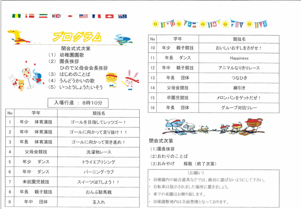 未就園児競技は何歳からでもご参加頂けます。9時30分頃を予定していますが進行状況で前後しますのでご了承下さい。