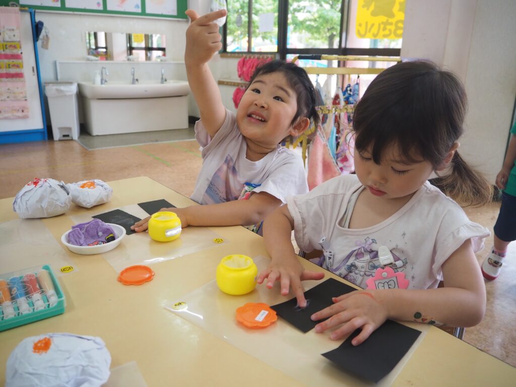 先生とお友達と一緒に楽しく過ごすお部屋です。製作物も飾られたりと温かみを感じられる保育室です。