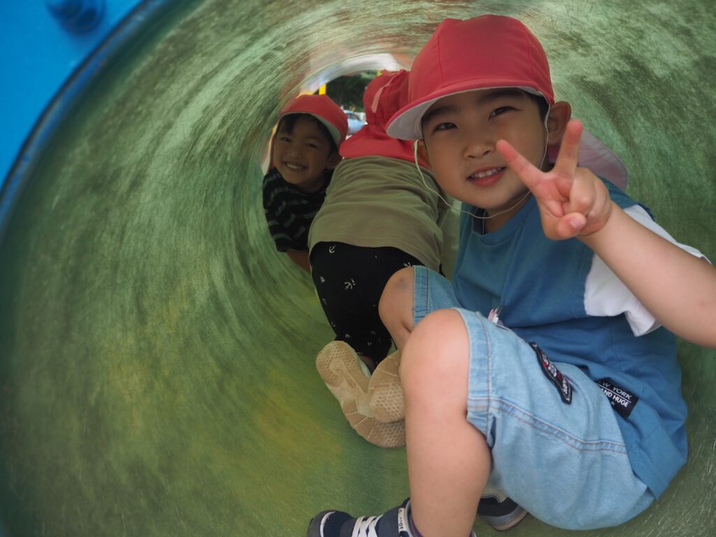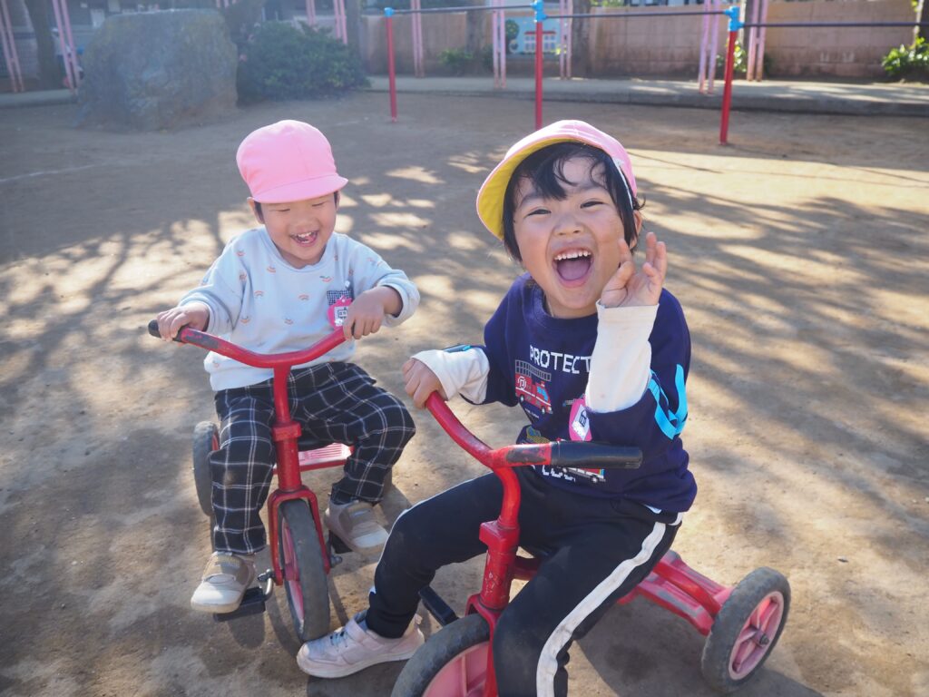 広々とした園庭は子どもたちの身体を動かすのに最適な環境です。かけっこ、鬼ごっこ、遊具や乗り物など遊び方もたくさん。