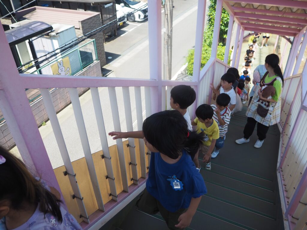 渡り廊下を渡って、道路の向こうにあるホールに移動します。道路を渡らず移動出来る為安全です。